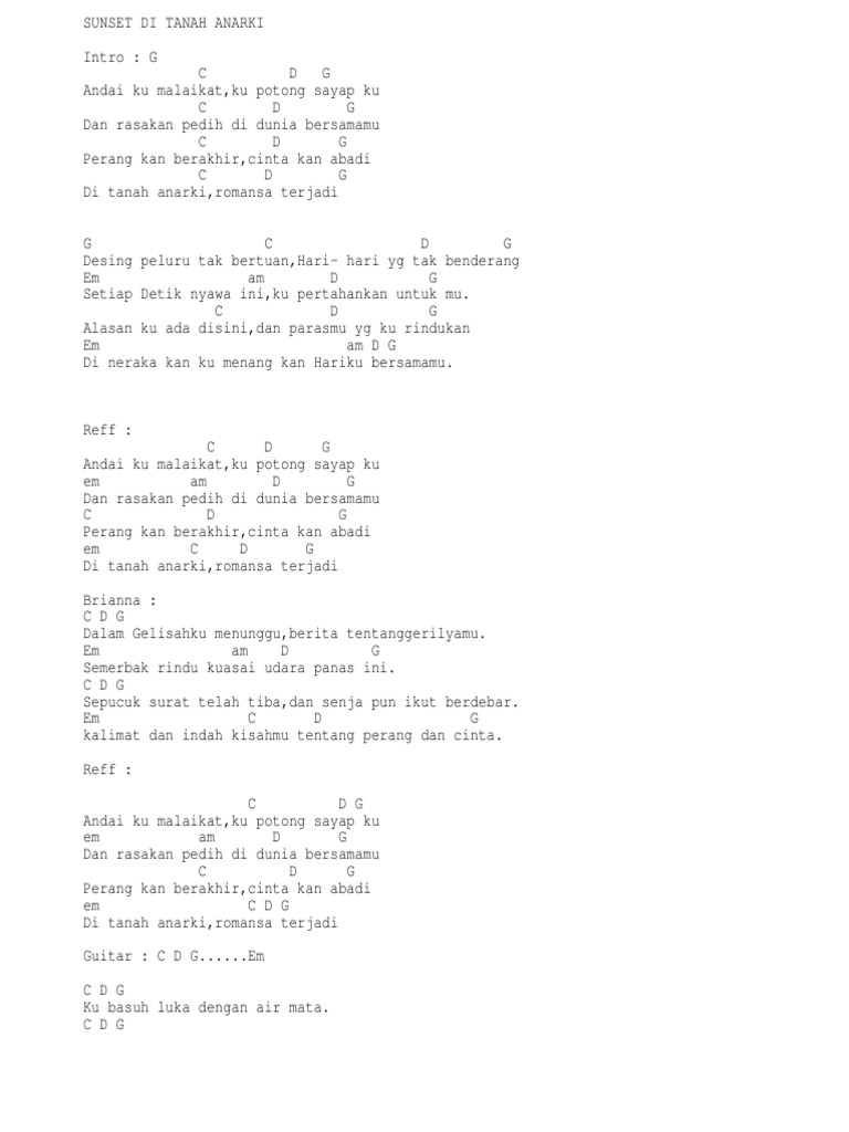 Sunset Di Tanah Anarki. Intro A Verse A D E A Andaiku malaikat kupotong sayapku Fm D E A Dan rasakan perih di dunia bersamamu A D E A Perang kan berakhir cinta kan abadi Fm D E A di tanah anarki romansa terjadi Interlude E Verse A D Desing peluru tak bertuan E A Hari-hari yang tak benderang Fm D Setiap detik nyawa ini E A kupertahankan untukmu A D Alasanku ada disini E A dan parasmu yang kurindukan.