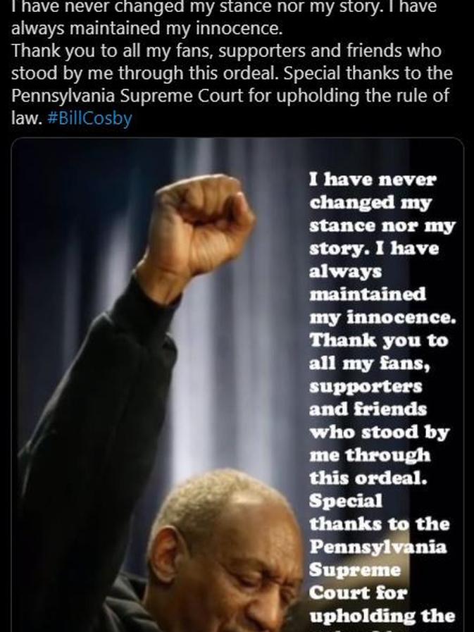 DetikHot Kamis 01 Jul 2021 0627 WIB Bill Cosby Bebas dari Penjara Usai Hukuman Kasus Pelecehan Seksual Dibatalkan. Bill Cosby resmi bebas dua jam setelah kasus pelecehan seksual yang dituduhkan kepadanya dibatalkan oleh Pengadilan Tinggi Pennsylvania.