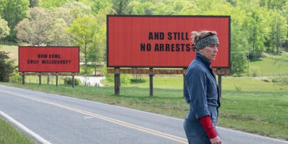 At the start of Martin McDonaghs film Three Billboards Outside of Ebbing Missouri Mildred Hayes played by the magnificent Frances McDormand drives past three worn-down neglected billboards. After seven months pass with no progress on the police investigation Mildred rents the titular three billboards outside town and uses them to very publicly ask why Sheriff Willoughby Woody Harrelson hasnt managed to make any.